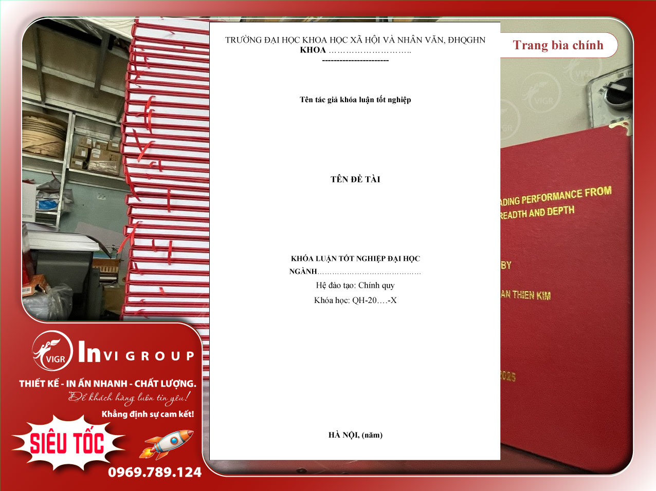Bìa cứng mạ nhũ vàng được bọc simily (giả da), hay decal, chữ và logo được làm bằng kỹ thuật ép kim nhũ vàng, bạc (dùng khuôn đồng ép lên bìa, sắc nét và ánh kim rất đẹp), ... Thường được dùng trong việc đóng luận văn thạc sĩ, luận án tiến sĩ, đồ án tốt nghiệp,…