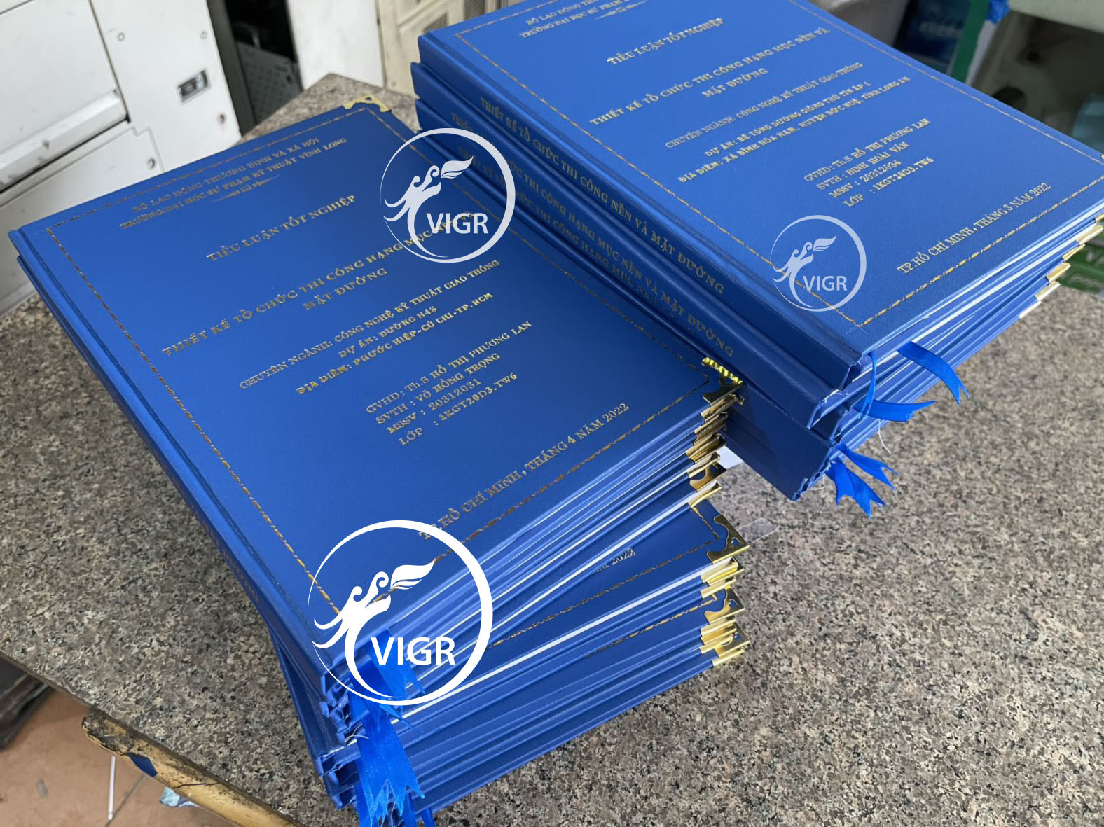 Bìa cứng mạ nhũ vàng được bọc simily (giả da), hay decal, chữ và logo được làm bằng kỹ thuật ép kim nhũ vàng, bạc (dùng khuôn đồng ép lên bìa, sắc nét và ánh kim rất đẹp), ... Thường được dùng trong việc đóng luận văn thạc sĩ, luận án tiến sĩ, đồ án tốt nghiệp,…