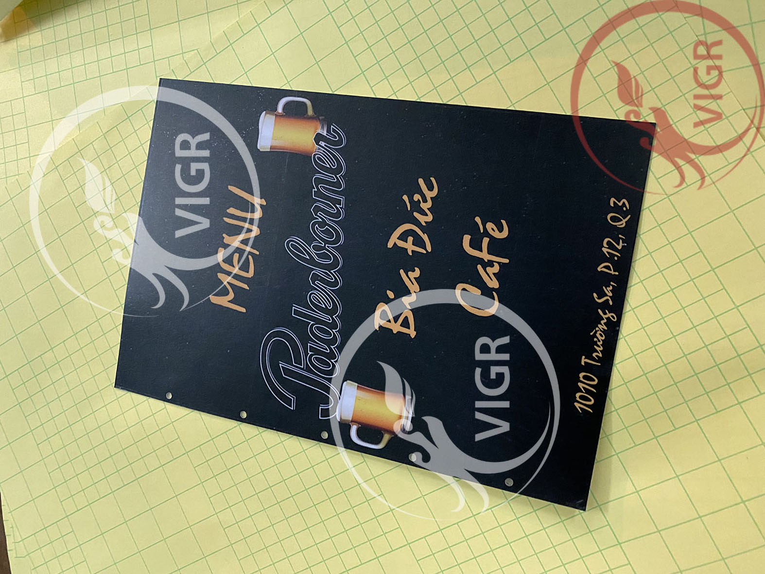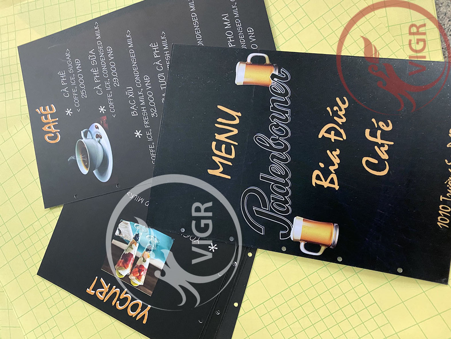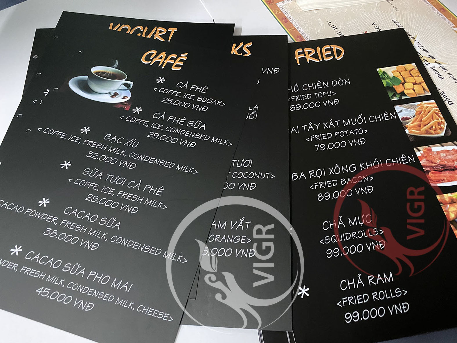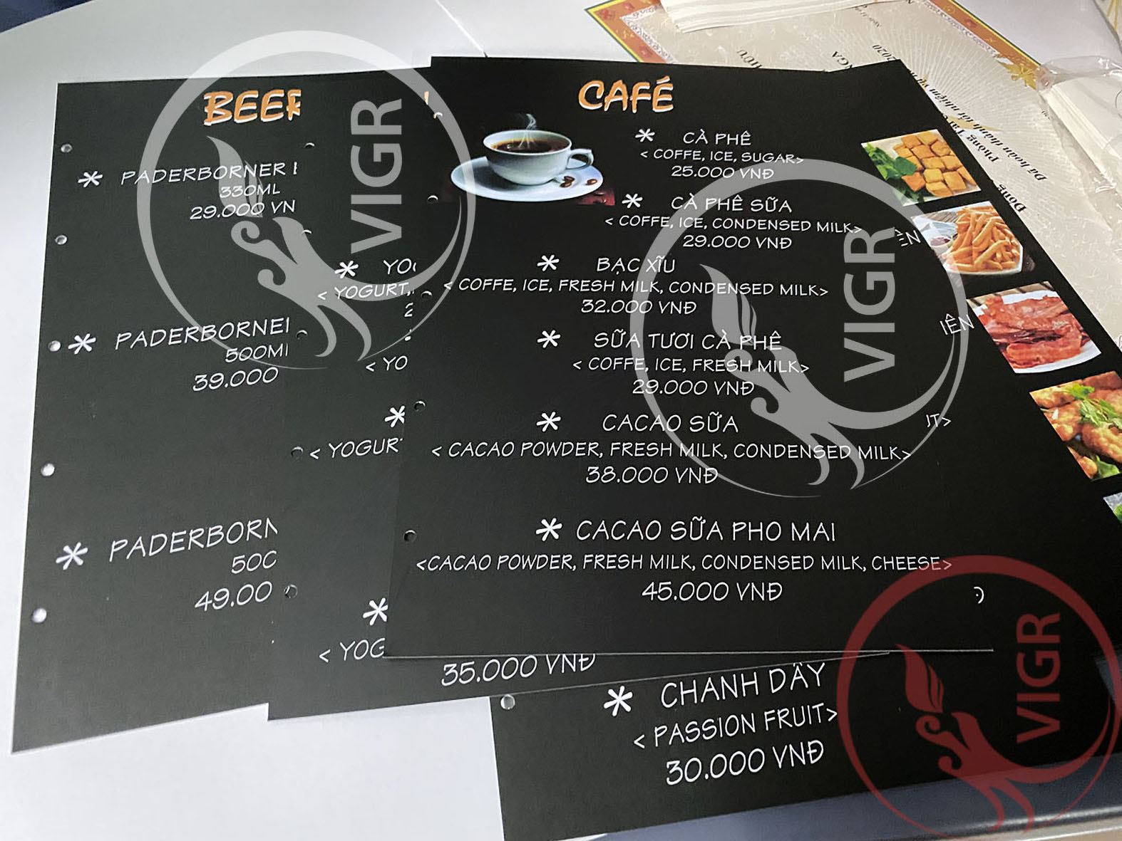 Ruột menu: Sử dụng giấy Couche 300gsm, Giấy chống nước 260gsm cao cấp.